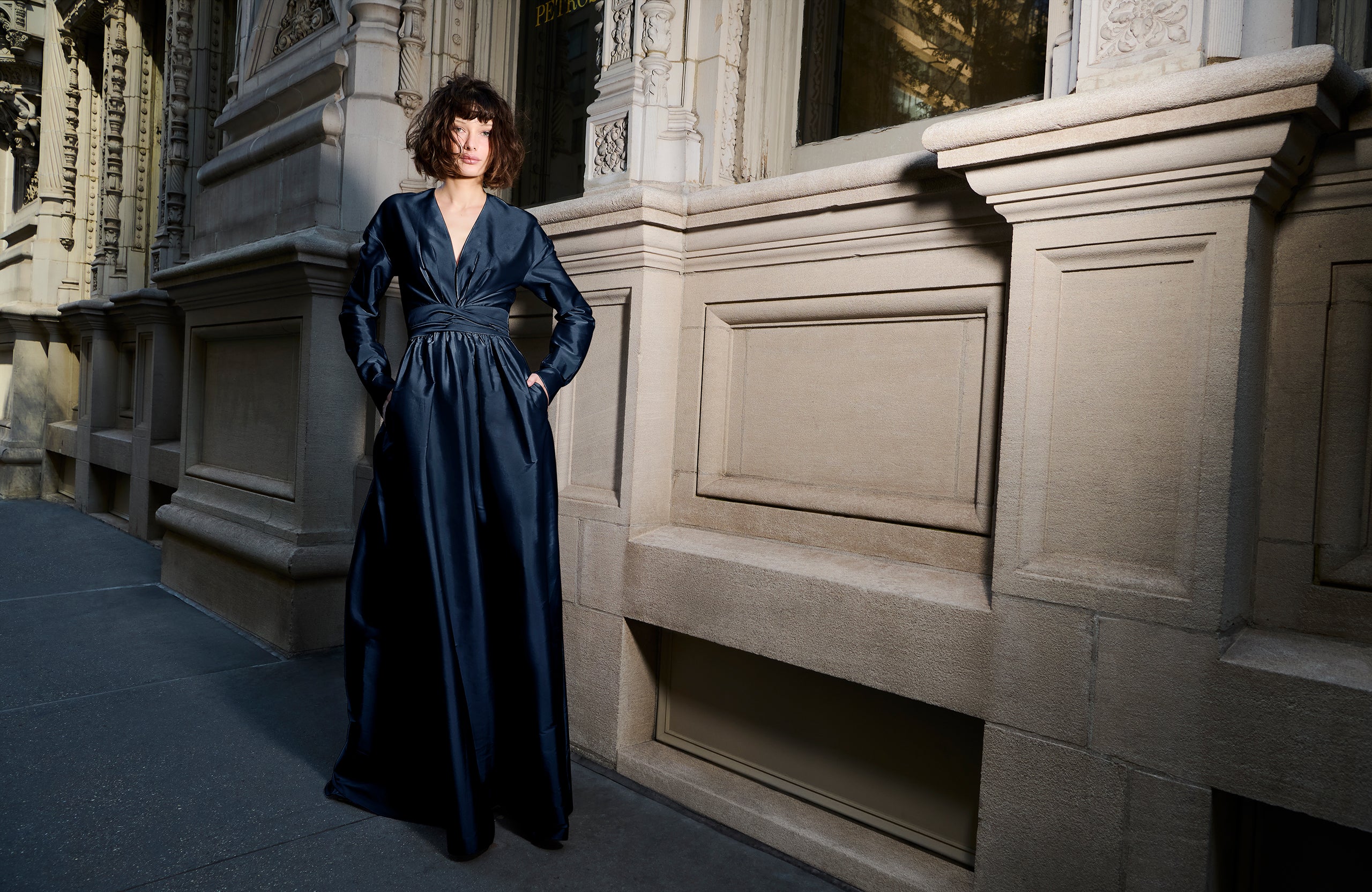 TAFFETA SLEEVELESS GOWN WITH FLOWERS NAVY