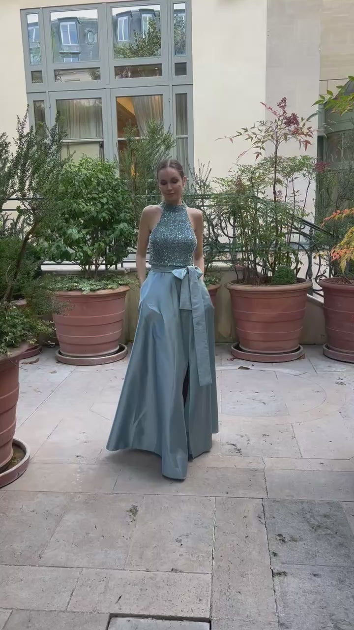 GLASS STRETCH BEAD MOCK NECK GOWN WITH TAFFETA SKIRT LIGHT BLUE
